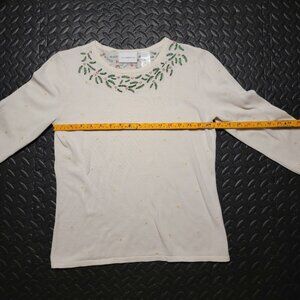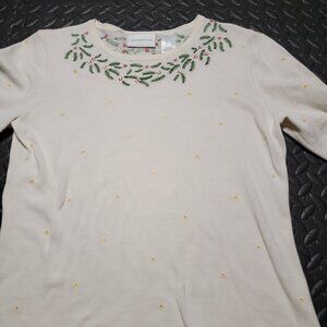 Style & Design: Women's Christmas Sweater by Liz Claiborne. Crewneck. Pullover. Long sleeves. Great holly Christmas / holiday design along the neck line and wrists. Green holly with red accents and silver sequins. There are little gold accents sewed into the body of the sweater. Great for your next holiday / Christmas party or Ugly Sweater Party.