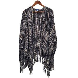 Womens Chunky Knit Fringe Poncho Cardigan Sweater One Size Black White Boho