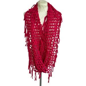 Womens Chunky Knit Poncho Infinity Loop Scarf Hot Pink Fringe Wrap Open Weave