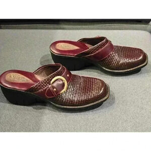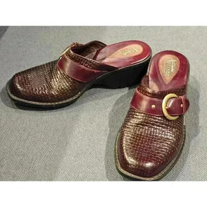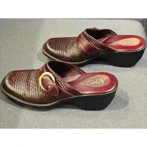 These are a pair of pre-owned women's Clarks Artisan Collection clogs. They are a dark burgundy color with a woven leather upper and a buckle closure. The clogs have a rubber sole and a slight wedge heel. The shoes are in good condition with some minor wear and tear on the leather. The size is 7M. The shoes are made in China and are made of leather with a leather upper and a rubber sole.