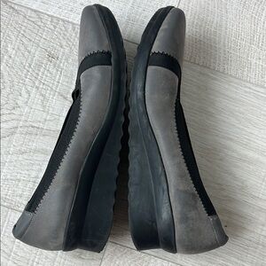 Experience all-day comfort with these Cloudsteppers by Clarks flats, featuring a stylish gray and black design. The smooth finish and decorative black trim add a touch of elegance to these versatile shoes, perfect for casual outings. Enjoy the classic silhouette and slip-on convenience for effortless wear.