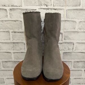 Women’s Clarks gray suede bendable Dream Moto fur booties boots fashion 6.5