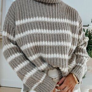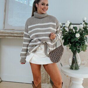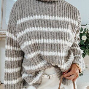 Stay warm and stylish this season with the Women's Classic Preppy Oversized Stripe Chunky Knit Turtleneck in a soft moss green and ivory stripe. The sweater’s hue has hints of taupe and gray undertones, making it a perfect neutral to pair effortlessly with any wardrobe staple. Designed with an ultra-soft, chunky knit and a cozy oversized fit, this turtleneck is ideal for layering or wearing alone on chilly days. The boxy silhouette offers both comfort and a modern preppy look, perfect for maximum style during the winter season. Style it with neutral bottoms or layered over a dress for an elevated, chic look Details: 100% polyester Moss/Ivory Chunky knit Stretch Stripe Turtleneck Drop shoulder Boxy fit Oversized Neutral aesthetic Maximum style Size & Fit: The Women's Classic Preppy Oversized Stripe Chunky Knit Turtleneck fits oversized. We love how chunky and cozy this sweater is. We recommend ordering your usual size for an oversized chunky look and fit. You can easily size down for a less oversized look. The fit is boxy, but not heavy. Refer to the measurements below and choose your perfect fit. XS - Chest: 50", Length: 25" S - Chest: 52", Length: 25" M - Chest: 54", Length: 26" L - Chest: 56", Length: 26"