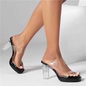 Women's Clear Heel Transparent Two Strap Chunky Block High Heel Slip on Sandals
