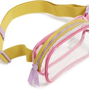 Features: Stylish transparent bag with colorful piping, designed to be worn around the waist or as a crossbody—perfect for festivals, concerts, or a day out. It features a secure zipper closure, water-repellent polyurethane material, and an adjustable strap for a comfortable fit.