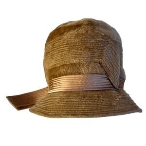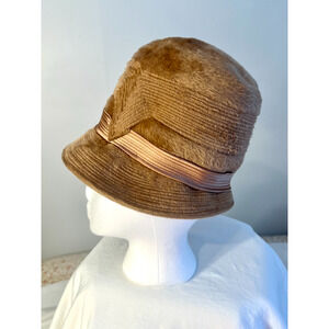 Womens Cloche Hat Bowler Hat Tan Faux Fur Mod Satin Sash Bow Germany 8" Vintage