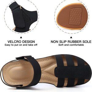 Features: Stylish low wedge sandals with a closed toe and slip-on design. Comfortable rubber sole, artificial polyurethane upper, and easy hook & loop closure. Great for staying chic and comfy during warm weather, whether you’re heading out casual or dressing up.
