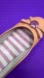 Women’s Coach peach authentic patent leather round toe flat shoe size 8 1/2. Footbed striped. Preloved, very good condition. Purple and silver signature round plate on toe.