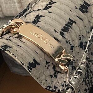 Women's Coach A01096 olive tone, slip-ons. Embossed snakeskin leather with rubber soles for added grip and balance. Tan leather interior, with moleskin at heels for added comfort. Big gold chunky, logo, chain accents on toes. Classic, comfort and style, these shoes are a win, win!