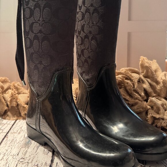 Womens Coach Tall Rainboots Black with Monogram Rubber Fabric Lace Back Size 9