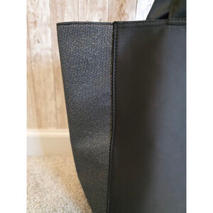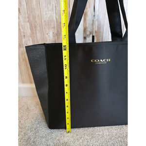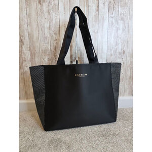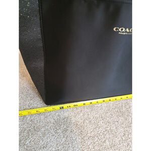 This is a Coach Fragrance tote bag, new without tags or box. The bag is black with a textured bottom and gold lettering. It features black handles and an open top. The interior is lined with black fabric. . There are no visible imperfections.