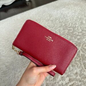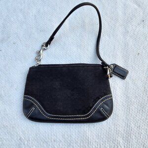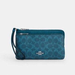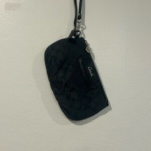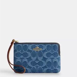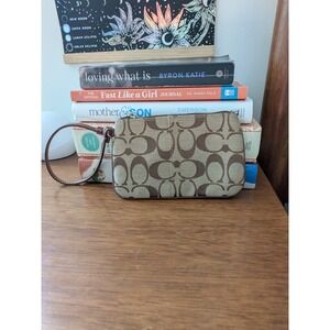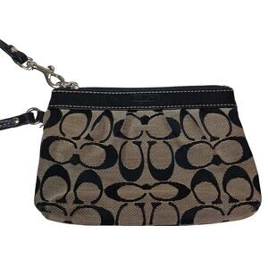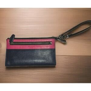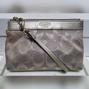 This is a pre-owned Coach wristlet. It features a light blue, textured leather exterior with a brown leather wrist strap and a brown leather Coach tag attached by a silver chain. The wristlet has a silver zipper closure. The interior is lined with a light blue fabric. There are some signs of wear on the exterior leather, particularly around the edges and corners. The wristlet measures approximately 6 inches in length and 4 inches in height.