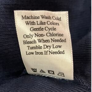 The sweater features a stylish navy ribbed knit design and a unique double-collared neckline.