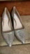 These are pre-owned Cole Haan pointed-toe pumps, size 8 B The exterior is covered in silver glitter, The interior lining is a light beige leather with the Cole Haan logo visible. The heels are a short, metallic silver, Like New Condition .