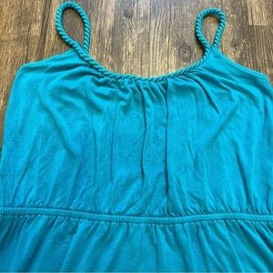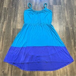 Beautiful blue and purple sun dress with cute spaghetti straps. Cinched elastic waist band. It has a small stain on lower part, not very visible when it’s on. Size tag has been cut off.