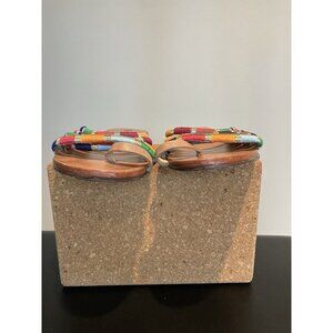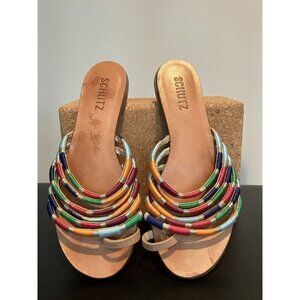 Schutz flat colorful slip-on sandals for women, size 7.5. Made in Brazil, these sandals feature a comfortable leather insole and a low heel height for all-day wear. The multi-colored design adds a pop of color to any outfit, perfect for travel or casual occasions.