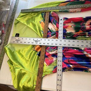 Bright and bold design with a mix of abstract patterns. Pleated skirt adds elegant flow. Lightweight fabric ideal for vibrant statements.