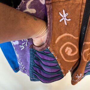 Womens Colorful Patchwork Hoodie Zip Up Embroidery Hood Pockets Medium Hippie