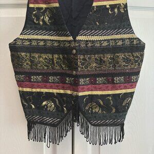 Multicolor vest with matallic thread giving it a shiny look. The vest is black with burgundy, and black accents, the shiny look comes from gold thread design throughout. The design features small hearts, birds and flowers. The back is black fabric with a tie. Three gold buttons along the front for closure and black fringe around the bottom of the front of the vest It is pre-owned but in excellent condition, no tears or stains. It's made by Jorjou American's Favorite.
