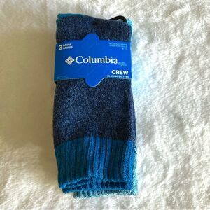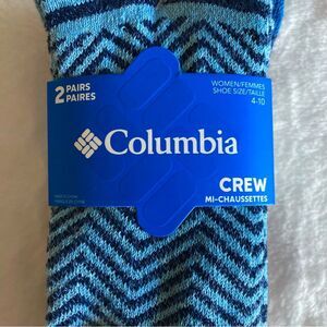 Two pack of ladies Columbia crew length socks. Fits shoe size 4-10 (sock size 9-11). Light and dark blue chevron pattern and dark blue Colorblock pattern. Cotton blend. Full cushion. Arch support. Moisture control fibers. Contains pre consumer recycled cotton. Reinforced heel and toe. NWT.