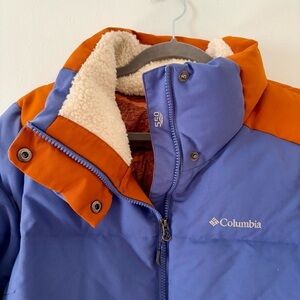 Stylish Columbia puffer jacket. Features a vibrant blue and orange design. Perfect for cold weather. Duck Down
