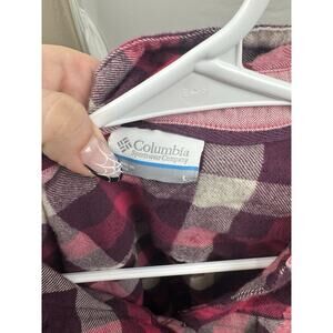 The product is a women's Columbia button-down fleece top in a size large and pink color. This stylish and cozy shirt is made with fleece fabric, perfect for keeping warm during the colder months. The regular fit and button-up style make it a versatile addition to any woman's wardrobe, suitable for both casual and more dressed-up occasions. Whether you're running errands or meeting friends for a casual outing, this Columbia fleece top in pink is sure to keep you comfortable and stylish.
