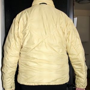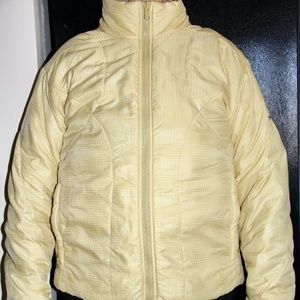 Women’s Columbia jacket. The label says Women’s XL, but it fits me like a Large. Shell is nylon/polyester. Brushed lining is polyester. Insulation is polyester. Excellent condition.