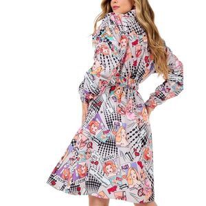 Keywords: wrap dress, comic-inspired, knee-length, V-neckline, long sleeves, casual, multicolor, front pockets, machine washable, new with tags, women's fashion, colorful dress, versatile style, brunch outfit, city day dress.