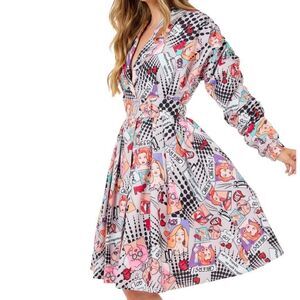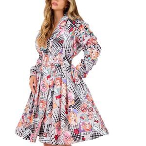 Unleash your playful side with this vibrant comic-inspired wrap dress, perfect for adding a splash of color to your casual wardrobe. The knee-length design features a flattering V-neckline and long ruched sleeves, offering a chic yet comfortable fit. The colorful multi-print design is sure to turn heads, while the convenient front pockets add a touch of practicality. Ideal for brunch with friends or a day out in the city, this dress is as versatile as it is stylish. Machine washable for easy care, and new with tags for a fresh start.