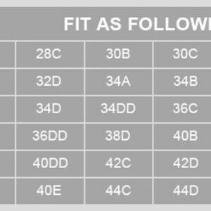 Large- 32DD, 34D, 34DD, 36C, 38B, 38C