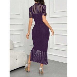Feature: Contrast lace, mock neck, mesh sheer, lettuce trim, short sleeve, split side, pencil midi dress for women