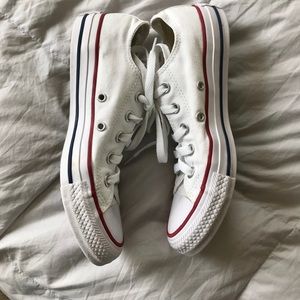 In very good used condition white converse . Size 6 in women’s . Has one dark scuff mark on the back side and some other very minor scuffs . Other wise the inside and outside is clean and vivid white .