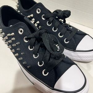 Womens Converse Chuck Taylor All Star Chrome Queen Low-Top Sneakers. These edgy shoes feature a sturdy black canvas upper decorated with allover silver spiked studs, creating an aggressive, punk-inspired look.
