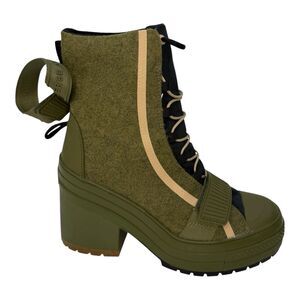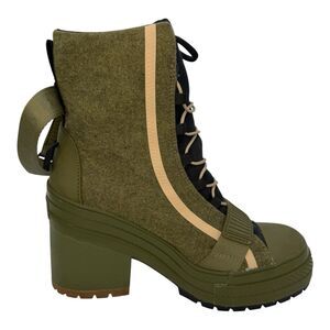 The Women's Converse GR82 Chuck Taylor All Star Boot in Olive/Black, size 8.5, is a stylish and versatile ankle boot designed for travel, casual wear, and workwear. With a round toe, lace-up closure, and adjustable strap, this boot offers comfort and convenience. The medium olive, black, and light fawn color scheme and star theme add a trendy touch to the platform style design. Made of felt and rubber, this Converse boot is durable and perfect for everyday wear.
