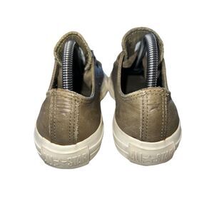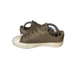 Pre-owned Converse Chuck Taylor All Star leather low-top sneakers in olive green. The shoes feature a classic silhouette with a round toe, lace-up closure, and a white rubber outsole. The upper is made of genuine leather with a subtle textured finish. The shoes have a white rubber toe cap and a white rubber midsole with the signature Converse All-Star branding. The laces are olive green and the tongue is made of a brown fabric. The shoes are in good condition with minor signs of wear on the leather and the outsole. The size is men's 3.5/women's 5.5/UK 3.5/EUR 36/CM 22.5.