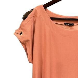 Elevate your casual wardrobe with this A.U.W. women's coral blouse. Size Large, this top boasts chic rolled sleeves and unique shoulder ring details for a modern touch. This lightweight blouse is ideal for day-to-evening looks.