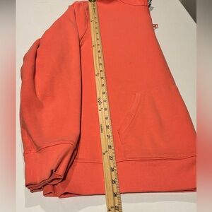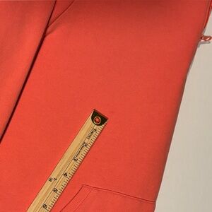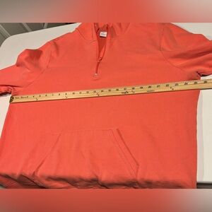 Bright coral 1/4 zip pullover sweatshirt. Fair condition with a small barely visible dark spot on front. Close up in pic 5 and a little more zoomed out in pic 6.