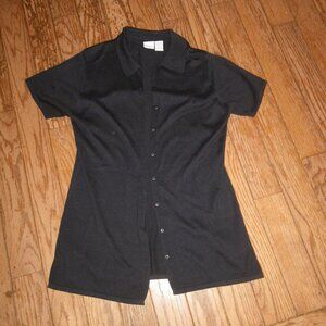 According to the label 60% Rayon 40% cotton. I'd describe this as a long Bodied button up Polo Style Shirt. Lightly worn from smoke free home.