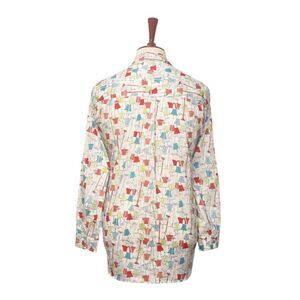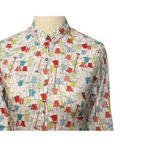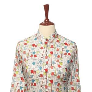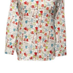 Womens Cotton Shirt Beige Colorful Lamp Print Blouse Button Up Top Medium Work