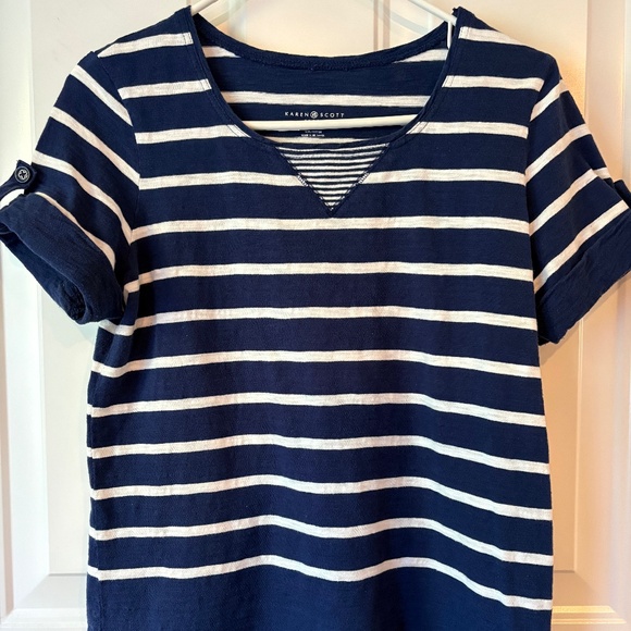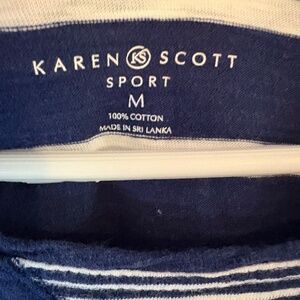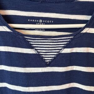 Karen Scott Sport navy blue and white striped top, excellent used condition, size medium, 100% cotton.