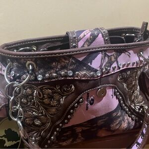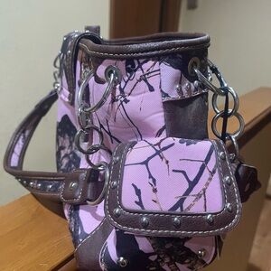 Never Used Camo Print and Pink Shoulder Bag for a Midwestern Princess. Has details of embroidery florals and stick patterns with diamond studding. Includes two side pockets, side zipper, and three zipper pouches insides.