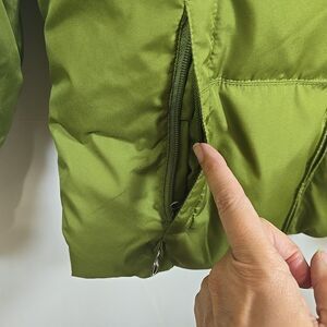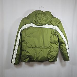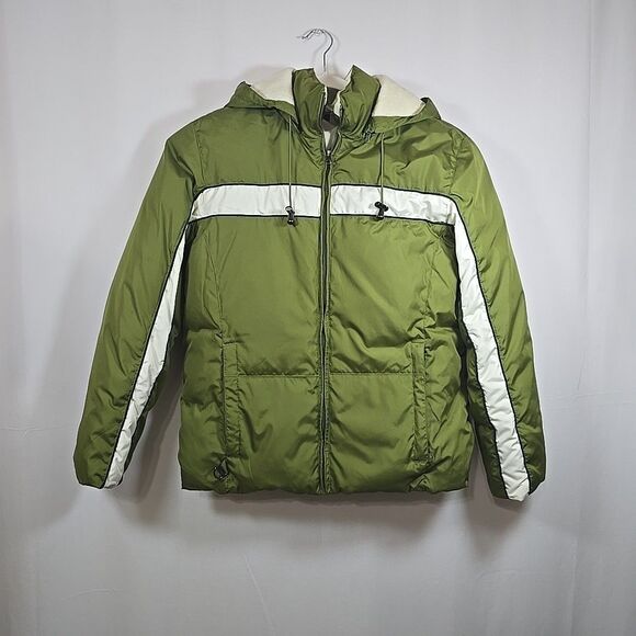 Great "Covington" ski winter puffy jacket, super warm, Size Medium. Avocado green with cream stripes, embroidered snowflake inside. Detachable hood, 2 zippered side pockets, 4 inner pockets (1 is zippered).