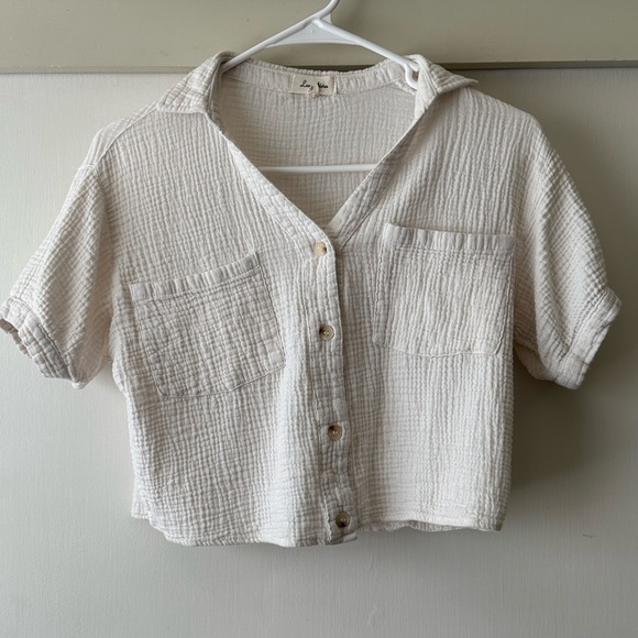 Elevate your style with this chic cream button-up crop top. Perfect for any occasion, this top offers a comfortable and stylish fit.