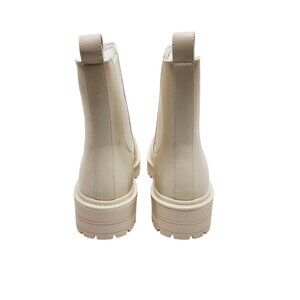 These women's Chelsea boots combine utilitarian practicality with timeless style. The cream leather upper offers a sophisticated touch while the chunky lug sole ensures durability and grip. Slip-on design with elastic side panels provides ease of wear. Ideal for adding a fashionable edge to casual outfits or for navigating various terrains with comfort and flair.