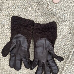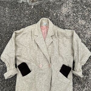 Gorgeous vintage Michelle Stuart 100% pure wool overcoat. Made in the USA with a speckled beige/tan tweed outer, soft pink satin lining, and unique dark knit/leather gloves tucked into the pockets (removable). Features a relaxed oversized silhouette, wide lapels, and two-button closure. A rare and elegant statement piece for fall/winter styling.