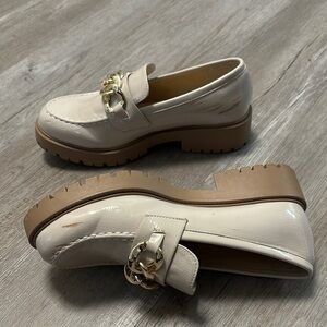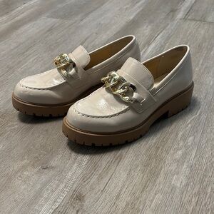 Step out in style with these elegant cream loafers featuring a chic gold chain detail. Perfect for any occasion, these shoes offer both comfort and sophistication.