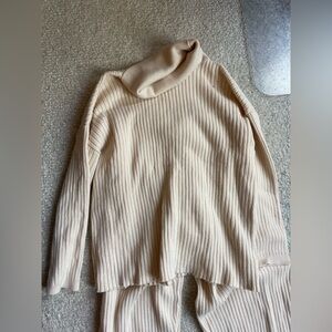 Stay cozy and stylish with this cream ribbed knit set. Perfect for lounging or casual outings. Turtleneck sweater and drawstring pants. Super soft.