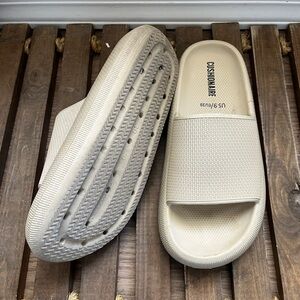 Step into comfort with women's sandals. These cream-colored slides offer a stylish and relaxed fit, perfect for any casual outing.