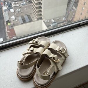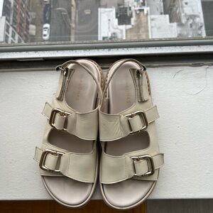 Step out in style with these elegant cream sandals featuring chic gold buckles. Perfect for any occasion, these sandals offer both comfort and sophistication.