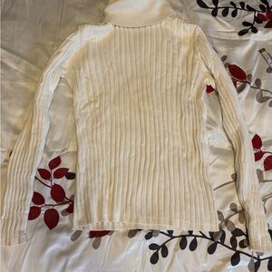 Chic and cozy cream turtleneck sweater with ribbed texture and long sleeves. Super flattering slim fit with stretch. Sleeve: 22”, Bust: 17.5” flat. Size Large.